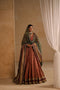 A striking deep crimson ensemble by Fatima Ashar intricately adorned with silver and gold handwork. The straight silhouette is paired with a rich embellished dupatta and farshi  sharara, creating time less look of elegance and grandeur.