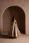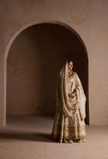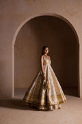 A timeless ode to tradition, Zeenat is a regal gold ensemble handcrafted with intricate zari and resham embroidery. The rich fabric is adorned with delicate motifs and finished with a beautifully embellished border. Draped in an ethereal dupatta with ornate detailing, this look captures the essence of old-world charm and royal elegance perfect for the bride who celebrates heritage with poise.
