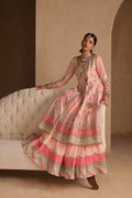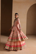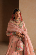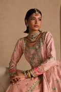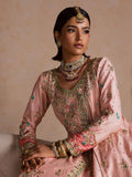 A Mesmerizing bubble pink bridal ensemble adorned with intricate hand embellish details in ganga jamni golden silver zardozi work along with soft hues of rose pink and mint green resham. This timeless creation radiats femininity and grace. A perfect choice for the bride who wishes to exude elegance with touch of romance.